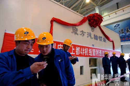 兩名工人在上都電廠新投產(chǎn)的4號(hào)機(jī)組旁欣賞自己與汽輪機(jī)的留念照片