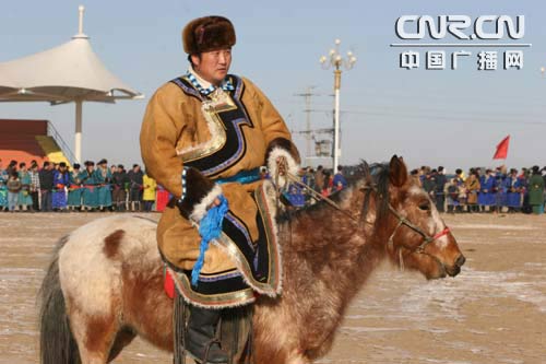 中廣網呼和浩特1月30日消息(記者阿都欽)蒙古族被稱為“馬背民族”,歷史形成以馬文化為主要內容的傳統(tǒng)。日前,在內蒙古東烏珠穆沁旗烏里雅斯太鎮(zhèn)舉行的第四屆“吉祥?烏珠穆沁”草原冰雪那達慕期間,“馬背文化”再次得到彰顯。10公里速度賽馬、馬上拾哈達、中蒙業(yè)余馬頭琴邀請賽等活動,將這里的冬季那達慕推向高潮。