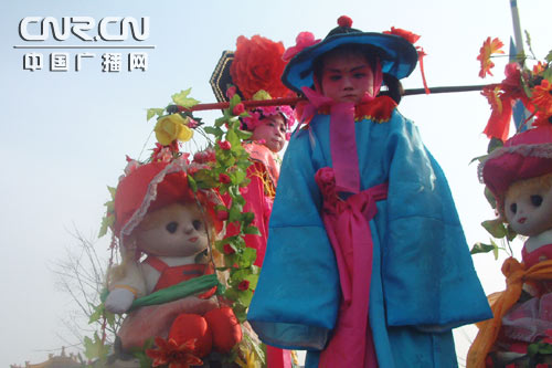 腦閣是把一特制的木架或鐵架綁在成人的后背上,把化了裝的兒童縛在木架上,活動時,成人踩著鼓點扭動,兒童也自然地跟著扭動。有的木架有轉軸,兒童可在上面翻跟頭。這一民間舞蹈,其來源據(jù)說是在正月里,人們把自家的小孩打扮得漂漂亮亮,腦在肩上,上街看紅火,在熱鬧的時候,就不由地跟著舞蹈起來,后來人們看著好看,就逐漸地形成了腦閣這一形式。