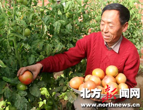 26日,呼和浩特市賽罕區(qū)大廠庫(kù)倫村三元無(wú)公害蔬菜基地的村民正在采摘新鮮西紅柿。據(jù)了解,該蔬菜基地的大棚外墻采用磚體聚苯材料夾層建成,能在棚外零下30攝氏度的環(huán)境里生產(chǎn)無(wú)公害蔬菜,以滿足市場(chǎng)需要。(辛永紅)