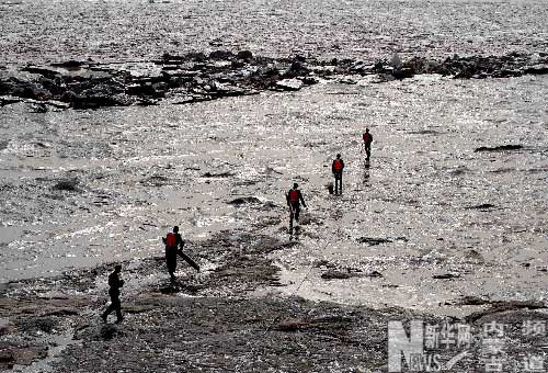 3月11日,武警戰(zhàn)士在黃河冰面上尋找安放炸藥地點
