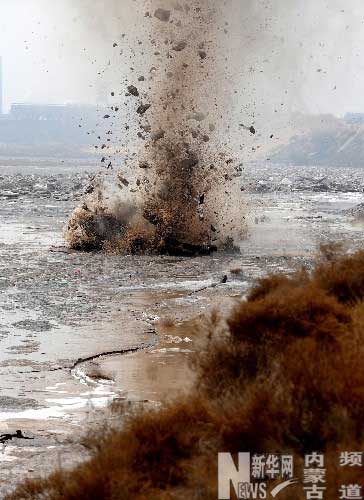 3月11日,內(nèi)蒙古烏海市在黃河烏達段進行黃河流凌爆破分凌演練,以應(yīng)對可能發(fā)生的黃河凌汛險情。由于目前內(nèi)蒙古河段河槽蓄水量達18億立方米,較多年平均值高出50%,且分布不均,加之一些河段早已形成的“懸河”形態(tài)及堤防達標率低,防凌形勢為40年來最嚴峻的一年。 (任軍川)