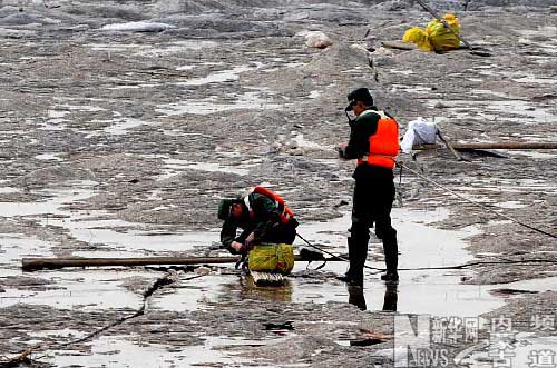 3月11日,兩名武警戰(zhàn)士正在黃河冰面上安裝炸藥