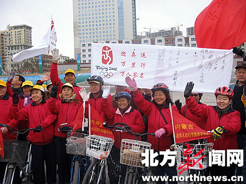 中廣網(wǎng)呼和浩特3月13日消息 3月12日8時(shí)30分,內(nèi)蒙古老年人自行車旅游者協(xié)會(huì)在呼和浩特市新華廣場(chǎng)舉辦活動(dòng),為騎行萬里赴云南省昆明市的100名老年人送行。百名老人沿途將為此次“為奧運(yùn)喝彩萬里行”活動(dòng)征集萬人簽名,萬人簽名旗將在奧運(yùn)會(huì)開幕前送到北京奧組委。