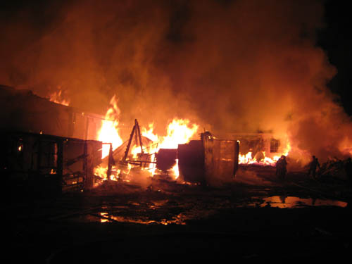 6日晚上21時56分,滿洲里市消防特勤大隊接到報警,并迅速出動3輛消防車、23名官兵趕赴現(xiàn)場。當(dāng)官兵距離火場1公里時,就能看到火光在黑夜中染紅了半邊天。指揮員意識到火場形勢比較嚴(yán)峻,隨即調(diào)集一中隊2輛、二中隊1輛消防車增援。