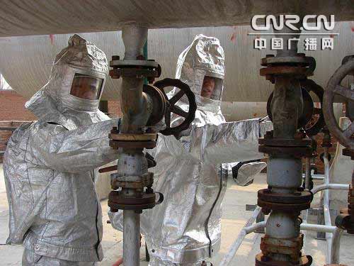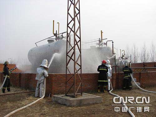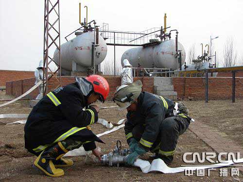 4月23日,阿榮旗消防大隊(duì)官兵深入鶴榮液化氣站進(jìn)行了春季消防安全演練周活動(dòng)。到場后,官兵首先對(duì)該單位進(jìn)行了全面熟悉,對(duì)滅火預(yù)案進(jìn)行了完善。接著,指揮員根據(jù)演練計(jì)劃,按照滅火預(yù)案進(jìn)行了實(shí)戰(zhàn)演練。15時(shí)10分,假設(shè)鶴榮液化氣站的罐區(qū)“1號(hào)”儲(chǔ)罐突然“泄露”并發(fā)生火災(zāi),請(qǐng)求救援。接警后,阿榮旗消防大隊(duì)立即出動(dòng)3臺(tái)消防車及16名官兵迅速到達(dá)現(xiàn)場,經(jīng)過現(xiàn)場偵查,泄漏著火處是因?yàn)閮?chǔ)罐上一閥門老化引起,空氣中燃?xì)獾臐舛纫呀?jīng)達(dá)到極限極易發(fā)生爆炸。根據(jù)現(xiàn)場的特殊情況,消防指揮員立即制定作戰(zhàn)方案,全體官兵分為三組立即展開緊急救援。第四組設(shè)置警戒線,把員工全部撤離至安全區(qū);另一組出2支水槍對(duì)泄漏設(shè)備周圍的空氣進(jìn)行稀釋,阻止氣體進(jìn)一步向其他區(qū)域擴(kuò)散,防止發(fā)生爆炸;第三組出一支開花一支直流冷卻罐體第四組的兩名戰(zhàn)士身著隔熱服,在水槍的掩護(hù)下爬到儲(chǔ)罐上更換老舊閥門。命令下達(dá)后,全體參戰(zhàn)官兵立即全面展開了滅火救援行動(dòng)。15分鐘后,閥門更換火災(zāi)成功撲滅。隨后,4把水槍繼續(xù)稀釋空氣中的殘余氣體,直到確認(rèn)已經(jīng)泄漏的氣體濃度降至正常范圍內(nèi)。20分鐘后,演練圓滿結(jié)束。