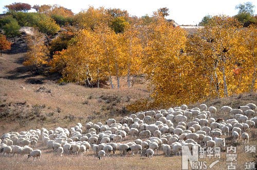 羊群在內(nèi)蒙古克什克騰旗境內(nèi)的林中吃草。 金秋時節(jié),內(nèi)蒙古草原進入牲畜出欄旺季。據(jù)內(nèi)蒙古自治區(qū)農(nóng)牧業(yè)廳夏季牧業(yè)普查結(jié)果顯示,2008年牧業(yè)年度,內(nèi)蒙古自治區(qū)出欄牲畜達7264萬頭(只)。(張嶺)