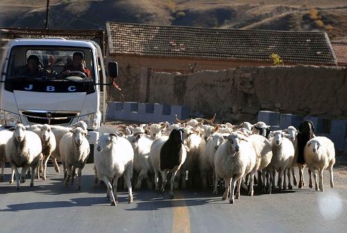 牧區(qū)經(jīng)紀人駕車趕羊走在內(nèi)蒙古克什克騰旗境內(nèi)的公路上