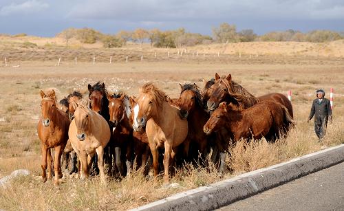 一名牧民趕馬走在內(nèi)蒙古克什克騰旗境內(nèi)的公路旁
