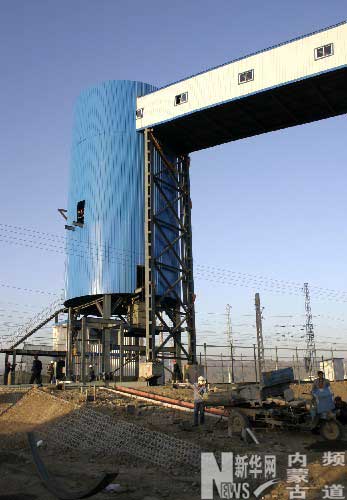 這是投入試用的古城灣煤炭裝車基地裝煤塔(攝于10月14日)。 近日,呼和浩特鐵路局包頭古城灣萬噸環(huán)保煤炭裝車基地基本建成并試運行。 新華社記者 劉軍 攝