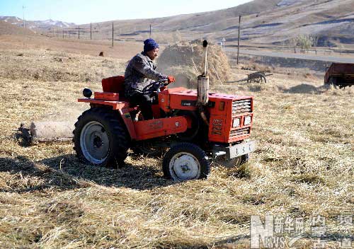 10月24日,察哈爾右翼中旗大灘鄉(xiāng)的一位農(nóng)民正在碾大麥。 近日,內(nèi)蒙古烏蘭察布高原地區(qū)出現(xiàn)降雪和大幅度降溫,當(dāng)?shù)剞r(nóng)民雪后繼續(xù)勞作,在寒風(fēng)中收獲晚熟的糧食作物。 新華社記者 任軍川 攝