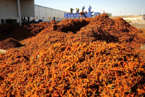10月30日,農(nóng)民正在東勝區(qū)一家沙棘生產(chǎn)企業(yè)交售沙棘果。 內(nèi)蒙古鄂爾多斯是我國重要的沙棘產(chǎn)地,沙棘保存面積達(dá)300多萬畝,約占全國沙棘總面積的70%。近年來,鄂爾多斯市引進(jìn)幾家大型沙棘加工企業(yè),使沙棘在發(fā)揮生態(tài)效益的同時(shí)也產(chǎn)生了很大的經(jīng)濟(jì)效益,項(xiàng)目區(qū)內(nèi)農(nóng)民每年從沙棘種植、管護(hù)、摘果等方面人均增加收入近千元。