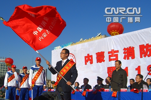 | 中廣網(wǎng)呼和浩特11月9日消息(記者鄭穎、梁軒)11月9日上午,內(nèi)蒙古消防總隊(duì)、呼和浩特市消防支隊(duì)在呼市新華廣場廣場隆重舉辦內(nèi)蒙古消防志愿者行動(dòng)啟動(dòng)儀式暨119消防宣傳日活動(dòng)啟動(dòng)儀式。上午9時(shí)30分,新華廣場彩旗飄揚(yáng),鑼鼓喧天,巨大的彩虹門下,來自內(nèi)蒙古醫(yī)學(xué)院、內(nèi)蒙古工業(yè)大學(xué)的1000余名消防志愿者整齊列隊(duì)。內(nèi)蒙古自治區(qū)副主席連輯、內(nèi)蒙古自治區(qū)公安廳副廳長阿斯林、內(nèi)蒙古自治區(qū)政府副秘書長孫惠民、內(nèi)蒙古自治區(qū)消防總隊(duì)總隊(duì)長王秋彧、呼和浩特市政府云共和副市長及自治區(qū)團(tuán)委、自治區(qū)教育廳、廣電局、地震局、紅十字會(huì)等相關(guān)職能部門領(lǐng)導(dǎo)參加了活動(dòng)。