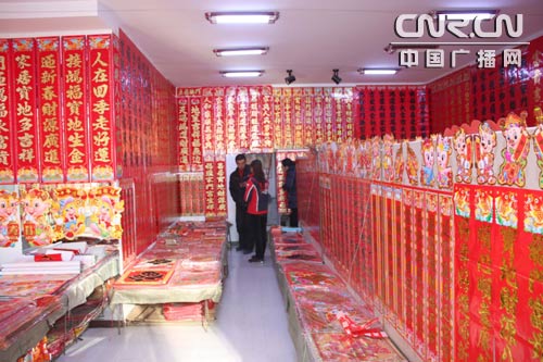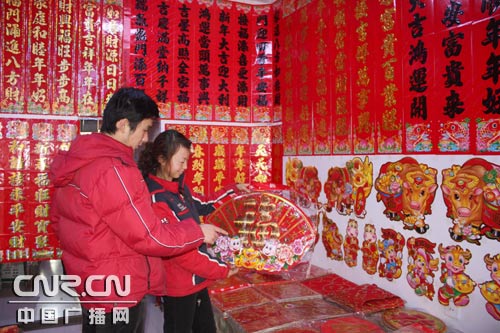 “鼠去牛來辭舊歲,民殷國富喜迎春”……一副副紅彤彤用不同材料寫的春聯(lián)掛滿了墻壁,品種繁多。店鋪內(nèi)已是“紅火”一片,更增添了春節(jié)前夕的祥和歡樂氣氛,讓人覺得農(nóng)歷牛年馬上就要到了。