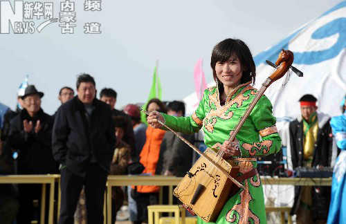 一名烏拉特后旗烏蘭牧騎的隊(duì)員在潮格溫都爾鎮(zhèn)查干敖包嘎查為農(nóng)牧民演奏馬頭琴(2月7日攝)。 元宵節(jié)前夕,內(nèi)蒙古各地烏蘭牧騎隊(duì)員冒著嚴(yán)寒深入到基層農(nóng)村牧區(qū),為各族群眾表演民樂(lè)、歌舞節(jié)目。 張領(lǐng) 攝