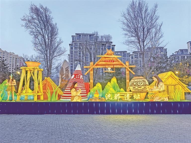 走進(jìn)沈那遺址公園,“歷史長(zhǎng)卷”燈組堪稱視覺焦點(diǎn)。3米高的卷軸式燈陣緩緩展開,燈火流轉(zhuǎn)間,遠(yuǎn)古彩陶的紋路、古城墻的磚石、現(xiàn)代都市的天際線依次浮現(xiàn),河湟文明的千年變遷在光影中徐徐鋪陳,讓人仿佛穿越時(shí)空。與之呼應(yīng)的沈那遺址主題燈組更具巧思,以齊家文化原始部落場(chǎng)景為原型,先民制陶時(shí)的專注、狩獵時(shí)的矯健通過燈光剪影生動(dòng)呈現(xiàn)!氨P古開天”燈組則以3.5米的高度成為此次燈展的視覺焦點(diǎn),身披火焰戰(zhàn)甲的盤古雕像手持巨斧,劈開混沌的姿態(tài)氣勢(shì)恢宏,在夜色中流光溢彩,這組花燈成為本次花燈展的文化地標(biāo)。