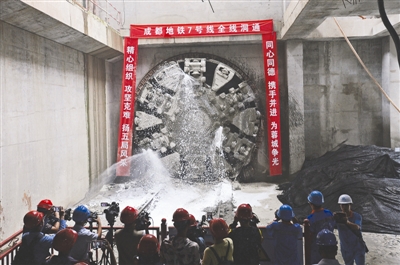 巨大的盾構(gòu)機刀盤不斷旋轉(zhuǎn),轟轟聲響,碎石伴隨著盾構(gòu)機奔涌出的潤滑劑液體,傾瀉而下。地鐵7號線7標太平園站至武侯大道站右線盾構(gòu)機在武侯大道站順利出洞,這也意味著7號線全線實現(xiàn)洞通。