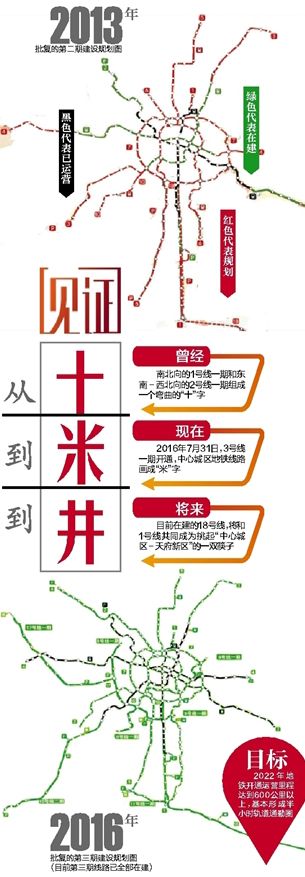 2016年7月31日,3號(hào)線一期開通,中心城區(qū)地鐵線路畫成“米”字