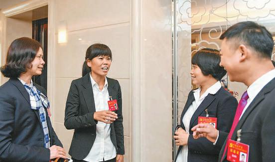 范國瓊代表(左一)、陳紹燕代表(左二)、陳小玲代表(左三)和張開輝代表在駐地暢談5年來身邊發(fā)生的可喜變化