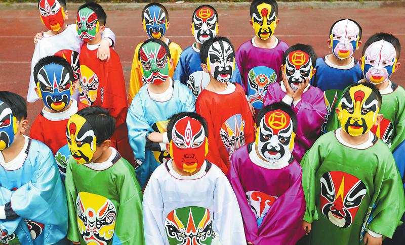 4月9日,四川大學(xué)附屬實(shí)驗(yàn)小學(xué)(西區(qū))二年級(jí)三班的學(xué)生和家長(zhǎng)在表演京劇節(jié)目。當(dāng)日是該校每周一國(guó)旗下主題教育活動(dòng)日,45名學(xué)生和21名學(xué)生家長(zhǎng)在成都京劇研究院專(zhuān)業(yè)老師的協(xié)助和指導(dǎo)下,自編自演了京劇節(jié)目《說(shuō)唱臉譜》,進(jìn)行了一場(chǎng)“經(jīng)典·傳承·成長(zhǎng)”為主題的教育活動(dòng)。新華社記者江宏景攝