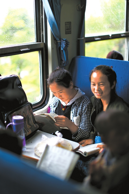 5月14日,在慢火車(chē)上看書(shū)的學(xué)生。