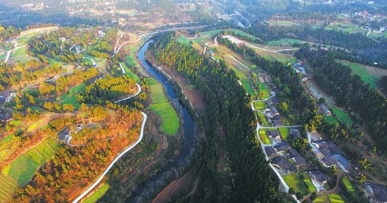 1月14日記者在閬中市棗碧鄉(xiāng)楊家河村上空俯拍的楊家河沿線風光。目前該村新開辦農家樂8家,旺季日均接待游客達到1500人次。本報記者李向雨攝 原標題:小河溝里搞旅游 村民致富有奔頭