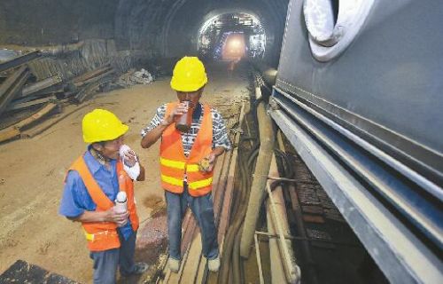 為改善隧道悶熱的作業(yè)環(huán)境,建設(shè)單位為隧道安裝了中央空調(diào)設(shè)備降溫除濕。圖為兩名工人在休息間隙來到空調(diào)口喝水乘涼。 記者郭堯 攝