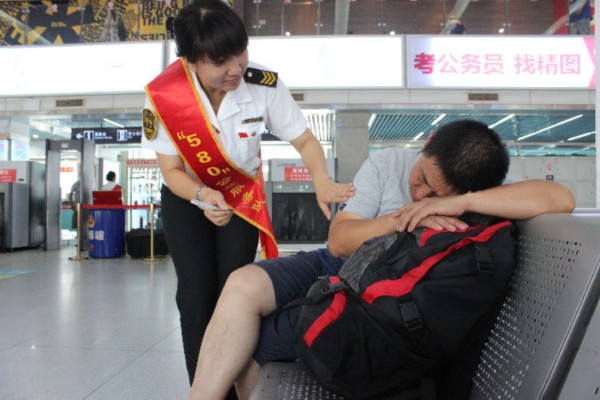 車站工作人員憑登記的車票發(fā)車時(shí)間叫醒打瞌睡的旅客