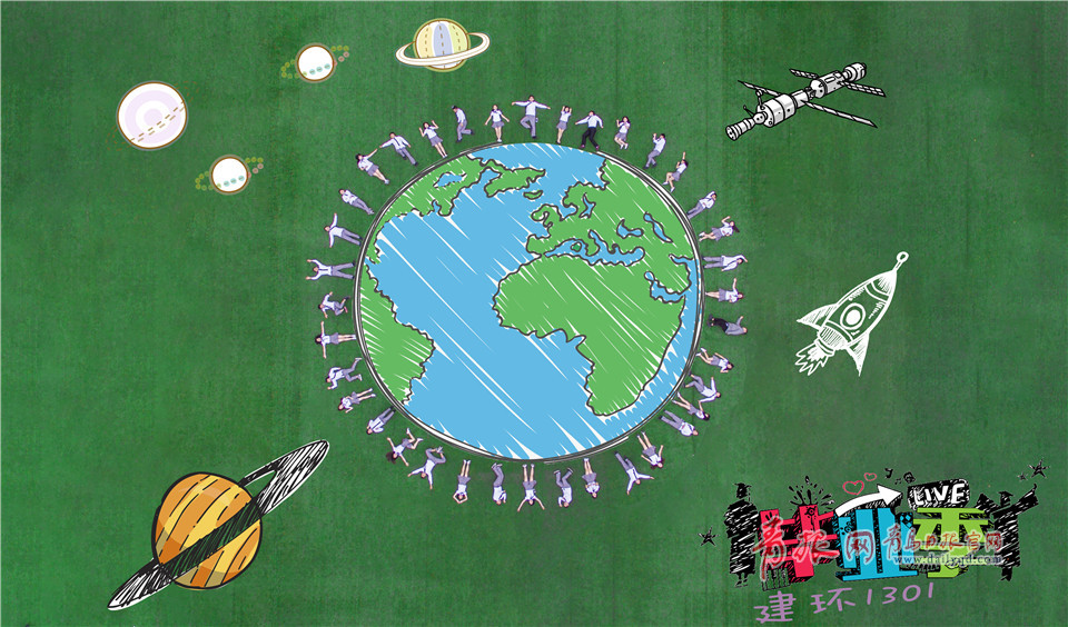 地球和宇宙的圖案,是新世界的象征。大家站在地球上的每個角落,奔跑跳躍,代表著對新世界的渴望和追求。為了使畫面活躍,全部采用了手繪卡通畫的風格,體現出世界的多彩與美好。