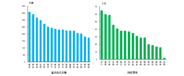 “藍天白云,繁星閃爍”天數(shù)最多的城市是威海市,為359天,最少的是聊城市,為174天。同比增加最多的是濟寧市,為65天。