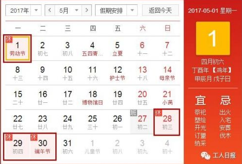 5月30日(星期二,農(nóng)歷端午節(jié)當(dāng)日)為國家法定節(jié)假日;