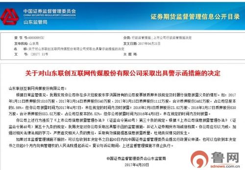 山東證監(jiān)局認為,聯(lián)創(chuàng)互聯(lián)上述行為違反了《上市公司信息披露管理辦法》第三十條的規(guī)定,決定對其采取出具警示函的監(jiān)管措施,并記入證券期貨市場誠信檔案。