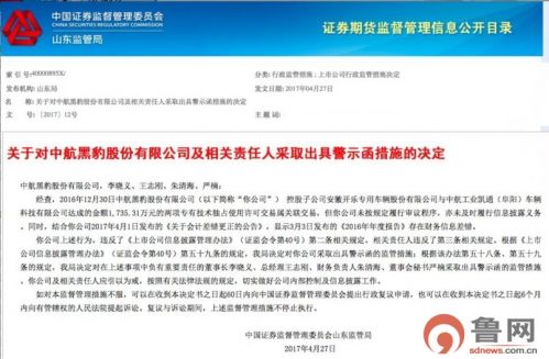 4月27日,山東證監(jiān)局發(fā)布《關于對中航黑豹股份有限公司及相關責任人采取出具警示函措施的決定》。