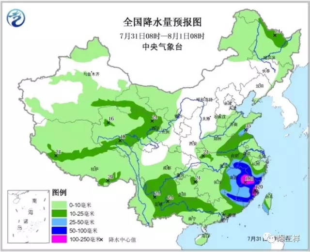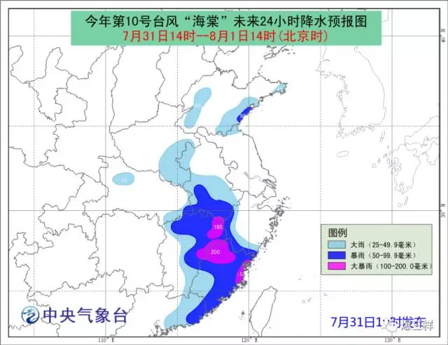 中央氣象臺7月31日10時繼續(xù)發(fā)布暴雨黃色預警:預計7月31日14時至8月1日14時,福建、廣東東部、江西東部和北部、浙江西南部、安徽西南部、湖北東部、河南東南部、山東東南部等地有大雨或暴雨,其中,福建西北部和東部、江西東北部等地的部分地區(qū)有大暴雨(100~200毫米),最大小時雨強可達60毫米。