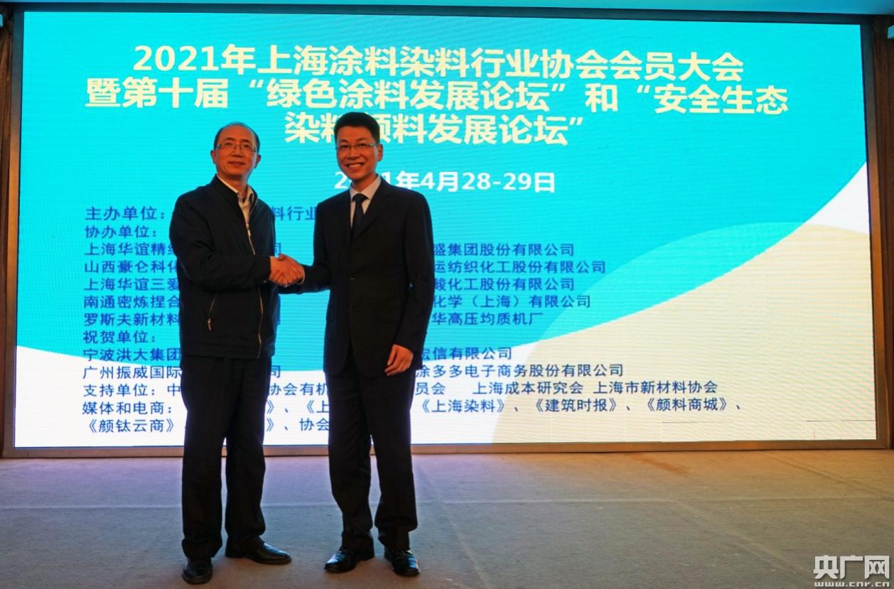 央廣網(wǎng)上海4月30日消息 4月28日,2021年上海涂料染料行業(yè)協(xié)會(huì)會(huì)員大會(huì)暨第十屆“綠色涂料發(fā)展論壇”和“安全生態(tài)染料顏料發(fā)展論壇”在上海市的美麗園大酒店隆重召開(kāi)。中國(guó)涂料工業(yè)協(xié)會(huì)孫蓮英會(huì)長(zhǎng)應(yīng)邀出席會(huì)議并指導(dǎo)工作,中國(guó)染料工業(yè)協(xié)會(huì)會(huì)長(zhǎng)史獻(xiàn)平作了書(shū)面報(bào)告、上海市經(jīng)濟(jì)和信息化委員會(huì)領(lǐng)導(dǎo)出席會(huì)議,上海市經(jīng)濟(jì)團(tuán)體聯(lián)合會(huì)領(lǐng)導(dǎo)致辭,知名專(zhuān)家、教授及重點(diǎn)企業(yè)作專(zhuān)題報(bào)告。本次論壇由上海涂料染料行業(yè)協(xié)會(huì)會(huì)長(zhǎng)何扣寶主持,會(huì)議審議協(xié)會(huì)工作報(bào)告和財(cái)務(wù)收支報(bào)告,并進(jìn)行了新老會(huì)長(zhǎng)的交接儀式。