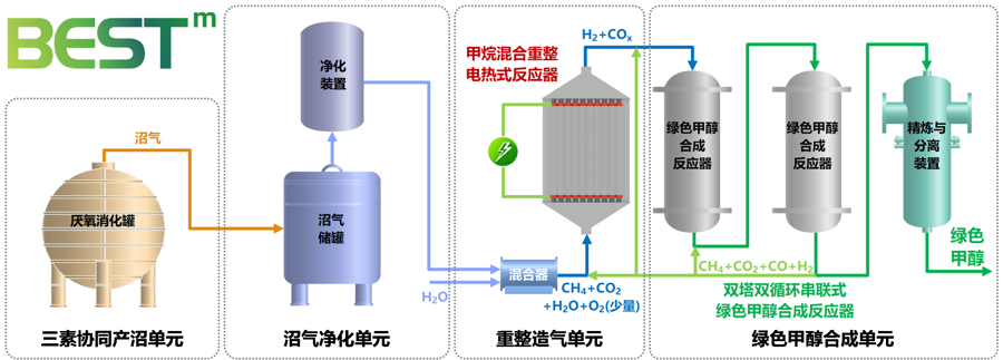 沼氣全碳轉(zhuǎn)化制備綠色甲醇工藝路線示意圖