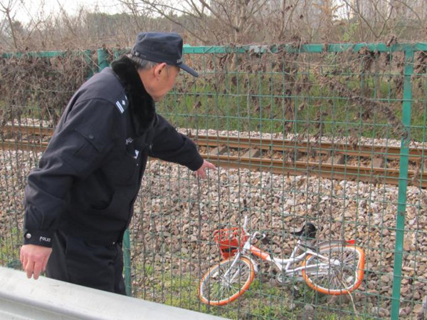 小伙兒將摩拜單車變“專車” 鐵軌路基竟成“專用停車位”