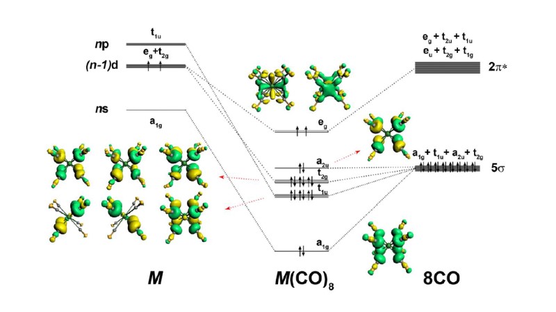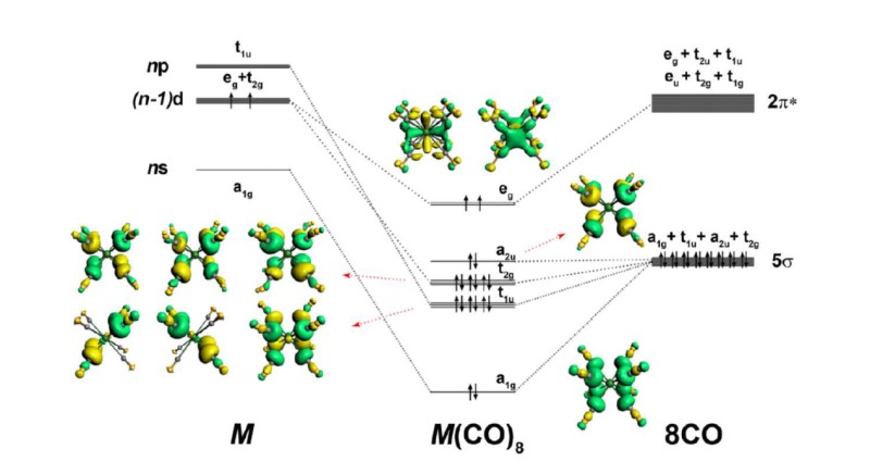 歸功于“一來一往”的σ-π配鍵,過渡金屬能夠與CO配體形成穩(wěn)定的羰基配合物。具體而言,CO將孤對電子給予對稱性匹配的中心金屬原子的空軌道,形成σ給予鍵;中心金屬原子d軌道電子則反饋進入CO的空的反鍵π軌道,形成π反饋鍵,兩相協(xié)同,使配合物得以穩(wěn)定存在。由于具有σ對稱性的s軌道擁有電子,而d軌道為空,堿土金屬元素幾乎正好與形成穩(wěn)定σ-π配鍵的期望條件背道而馳,因此一般認為堿土金屬元素無法像過渡金屬一樣與CO配體形成穩(wěn)定的羰基配位化合物。