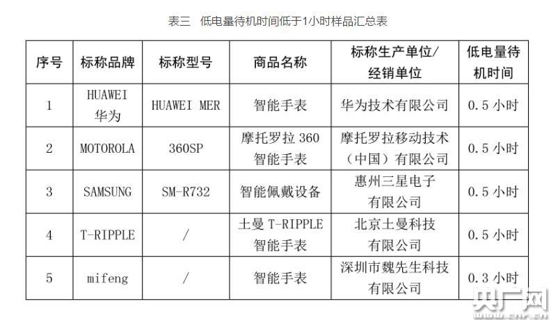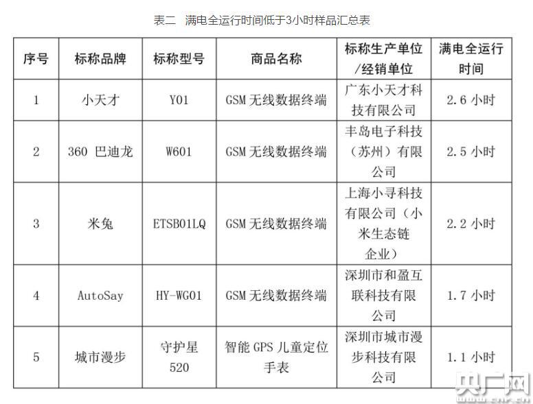 測(cè)試結(jié)果顯示,20塊樣品的滿電全運(yùn)行時(shí)間均不超過(guò)10小時(shí),最長(zhǎng)的為9.2小時(shí),最短的為1.1小時(shí)。其中僅2塊樣品達(dá)到8小時(shí)以上,5塊樣品低于3小時(shí)且都為兒童智能手表(詳見表二)。
