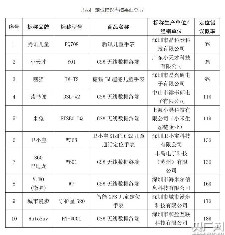 此外,由于目前兒童智能手表的重要用途之一是定位,本次試驗(yàn)測(cè)試了10塊兒童智能手表的定位準(zhǔn)確性。結(jié)果顯示,兒童智能手表在地下或嘈雜環(huán)境中定位易出錯(cuò)。在10塊兒童智能手表樣品中,僅有“騰訊兒童”和“小天才”的定位錯(cuò)誤概率小于5%,另外8塊的定位錯(cuò)誤概率超過(guò)5%(詳見表四)。兒童智能手表定位易出錯(cuò)的地點(diǎn)主要集中在地下停車場(chǎng)、地鐵站、環(huán)境嘈雜的商場(chǎng)等區(qū)域,而在學(xué)校、醫(yī)院等區(qū)域定位準(zhǔn)確性比較理想。