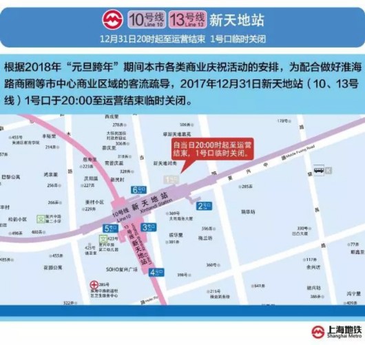 據(jù)上海發(fā)布官方微信,上海發(fā)布準(zhǔn)備跨年夜出去玩的小伙伴們注意啦!申通地鐵集團(tuán)說,12月29-31日,1、2、7、8、9、10號線執(zhí)行周末延時運行圖。同時,12月31日20點起至運營結(jié)束,2、10號線南京東路站臨時封站,10、13號線新天地站臨時關(guān)閉1號口。