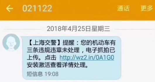 記者看到,發(fā)送該短信的號碼為021122,內(nèi)容為:[上海交警]提醒,您的機(jī)動車有三條違規(guī)違章未處理,電子抓拍已上傳。點(diǎn)擊鏈接并安裝激活查看詳情處理。