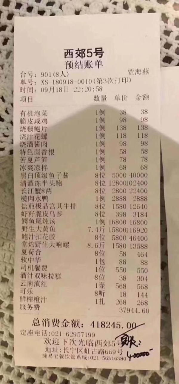 9月19日,一份“天價賬單”在網上引發(fā)關注。網傳“天價賬單”照片顯示,其出自一家名為“西郊5號”的飯店,位于上海虹古路669號,就餐時間為9月18晚,8人點了20道菜,最后算上服務費,共花費418245元,實付40萬元。