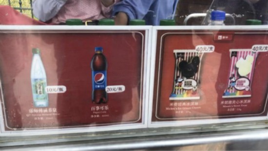 記者入園后發(fā)現(xiàn),基本每隔幾米就有銷售食品飲料的餐車及店鋪,一瓶礦泉水標價10元,一瓶可樂20元,一支冰淇淋40元,爆米花35元一盒。