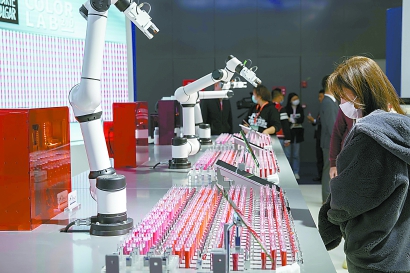 觀眾在參觀一款會做口紅的“手臂機器人”。賴鑫琳 攝