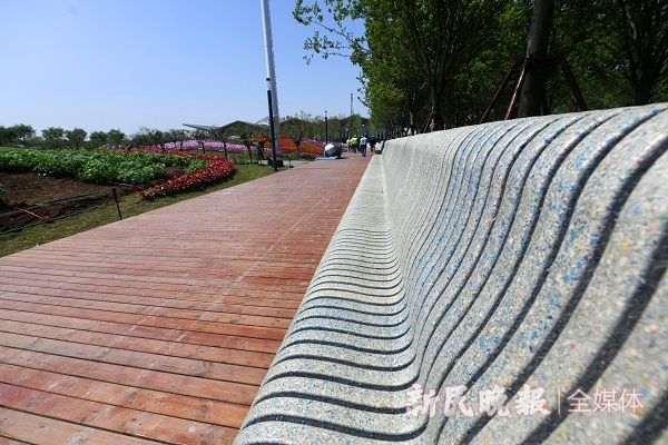在本屆花博會策劃之初,生態(tài)辦博就是一項重要目標(biāo)。如何在花博園的布置中體現(xiàn)環(huán)保理念?策劃團(tuán)隊當(dāng)時提出了好幾個方案,比如樹脂蓋板、環(huán)保材料制作的垃圾桶等,最后脫穎而出的就是如今的環(huán)保觀花長椅方案。“主要是遵循以人為本的理念,希望能提升游客的觀展體驗,希望游客在逛累休息時,能夠用到這些長椅,一邊欣賞花海,一邊了解這些椅子背后的故事!