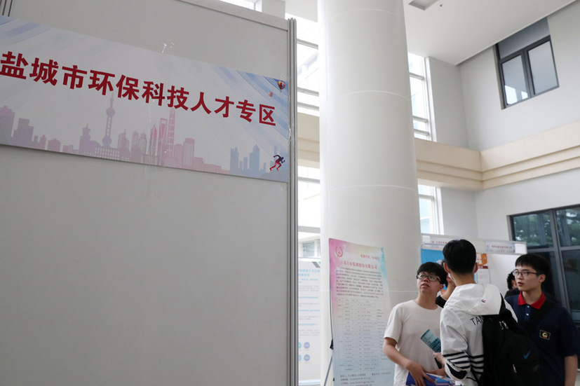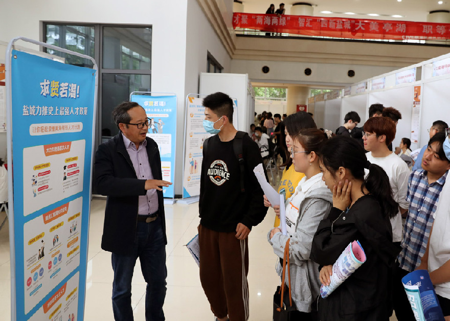 5月19日,鹽城市人才服務(wù)中心的工作人員向畢業(yè)生介紹鹽城的人才引進(jìn)政策和福利。