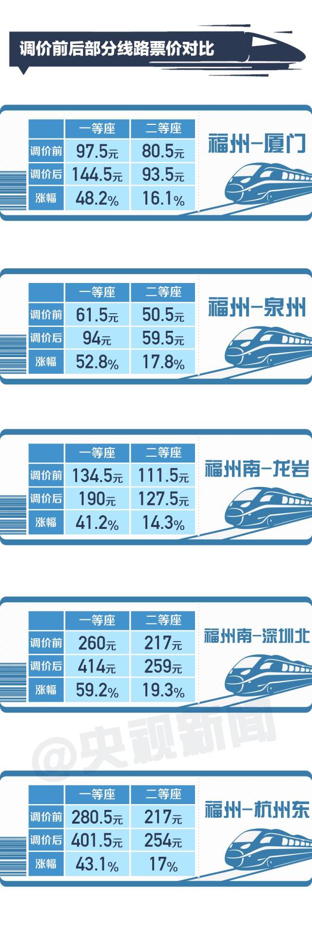 這次調(diào)價(jià)是中國(guó)高鐵第一次跨省調(diào)價(jià)。具體怎么調(diào)?會(huì)漲價(jià)嗎?對(duì)百姓出行有何影響?來(lái)看看從福州(福州南)始發(fā)到這些地方的票價(jià)漲了多少。