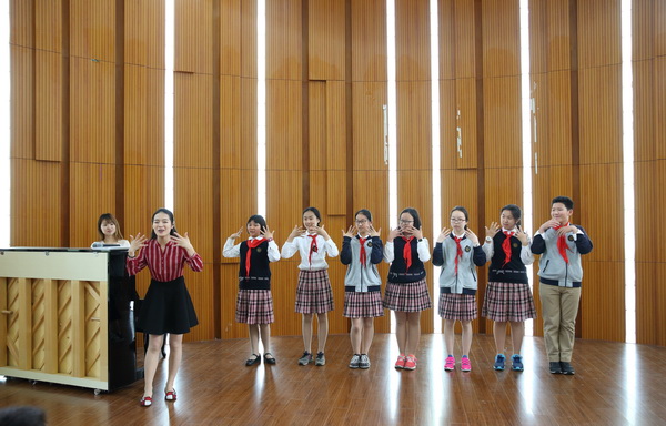 講演結(jié)束,曾經(jīng)參演中文版《音樂之聲》的趙嘉艷,還帶著市西初級中學(xué)合唱團(tuán),排練起了《音樂之聲》里耳熟能詳?shù)暮铣抖邅磉洹贰?/p>