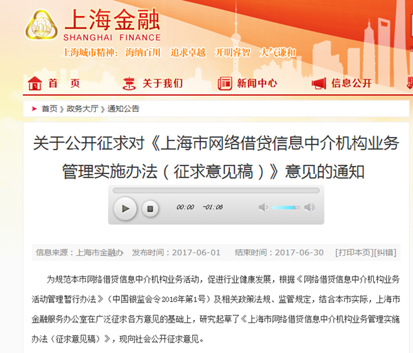 據(jù)中國(guó)網(wǎng)消息 6月1日,上海金融辦下發(fā)《上海市網(wǎng)絡(luò)借貸信息中介機(jī)構(gòu)業(yè)務(wù)管理實(shí)施辦法》(征求意見稿)(以下簡(jiǎn)稱“征求意見稿”)。